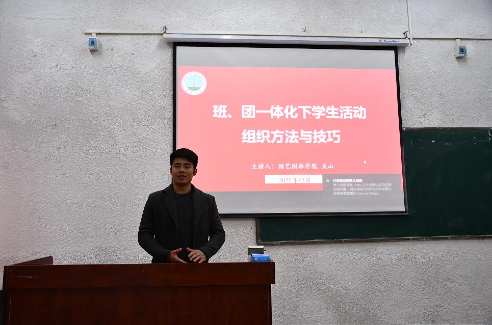 园艺园林学院辅导员吴山以《班团一体化下学生活动组织方法与技巧》为主题深入解读了高校共青团改革实施方案,围绕全团“凝聚青年、服务大局、当好桥梁、从严治团”四维工作格局,深入实施高校基层团支部“活力提升”工程,积极推进“班级团支部与班委会一体化运行”工作,突出以班级团支部为核心的班集体建设。同时,结合我校班团一体化进行了详细阐述,第一,明确实施范围;第二,基本目标;第三,组织建设;第四,相关要求。着重强调,作为一名班级团支部书记,应该深入了解班级每位同学情况,关心呵护每一位同学健康成长,真正做到聚似一团火,散若满天星,齐心协力,共同进步。