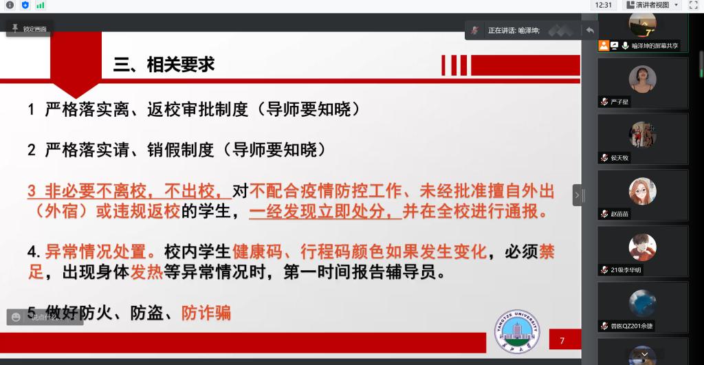 其次,向同学们讲述目前学校相关要求及管控措施,离校、返校需提前审批报备,手续办理完成后方可离校、返校,行程码出现异常,身体出现异常第一时间报告辅导员,注意防火、防盗、防诈骗。