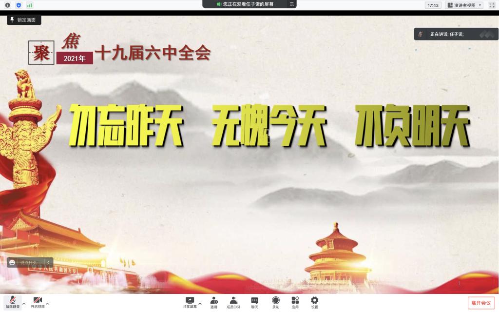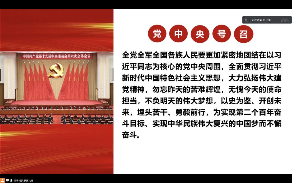 (通讯员:黄玲玲 吴广)4月21日中午2时,动科学院在线上开展以“勿忘昨天,无愧今天,不负明天”为主题的中共十九届六中全会相关内容的学习活动。参与本次活动的有:动科学院青马学习小组全体成员、20级与21级各班的团支书以及20级的预备党员。本次活动由学习科创部部长任子诺担任主讲人,同时还邀请到了团委书记王海洋老师。