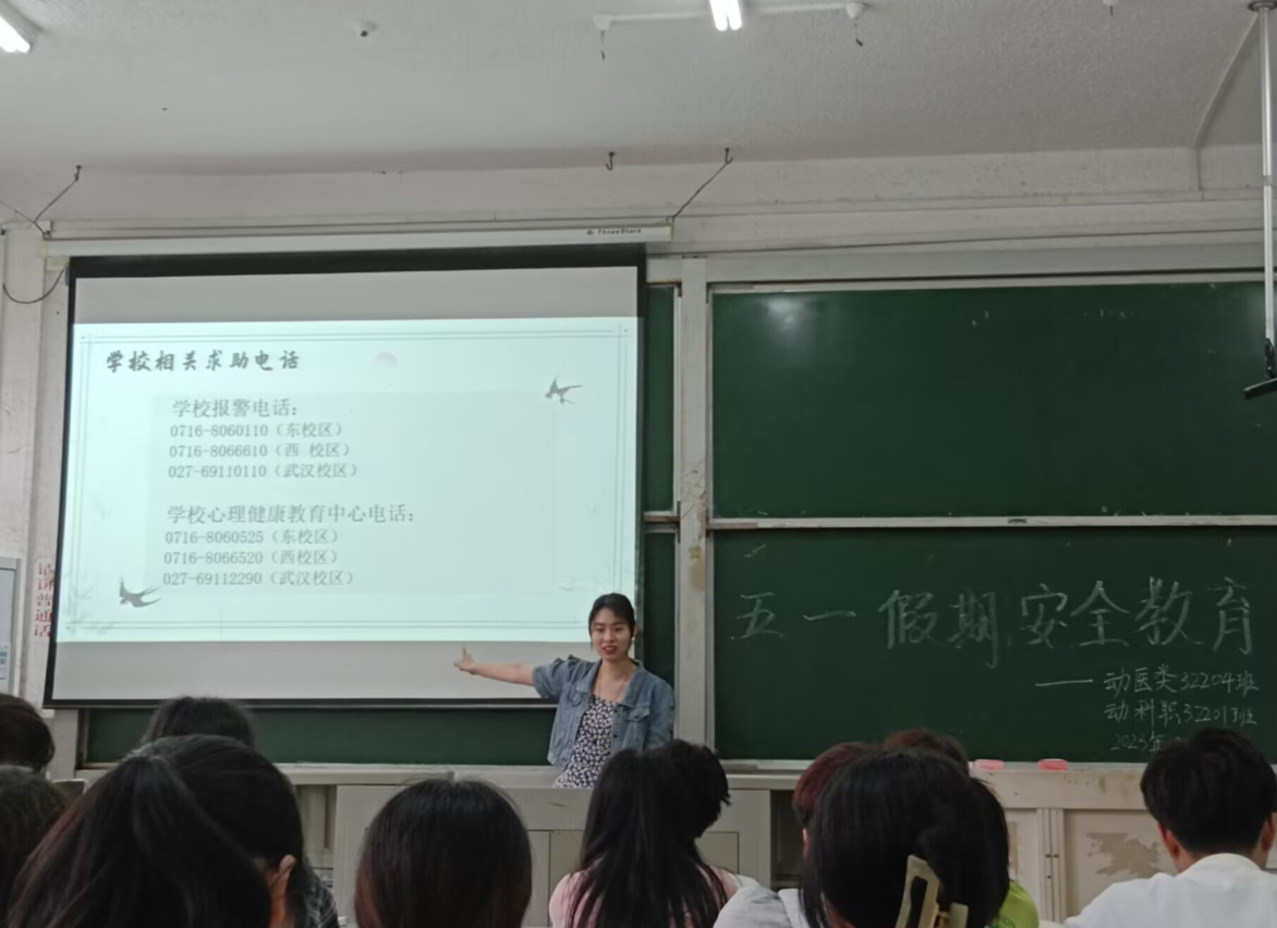 班会分为三部分开展,从“五一”假期放假安排、假期日常安全管理以及节前学生安全教育三方面一一进行告知及讲解,保证同学们安全的度过“五一”假期。各班班主任首先介绍放假时间安排,提醒学生注意放假时间,合理安排行程。随后,各班级安全委员从人身、财产安全角度,结合以往发生的案例,向学生们生动形象的进行安全宣传教育,从安全出行、消除安全隐患、小心提防诈骗、远离不良网贷、科学防范溺水、确保身心健康、筑牢寝室安全七方面逐一进行讲解。并提醒同学们在离校前登记好离校信息,保持通讯畅通,遇到问题要及时主动汇报,寻求帮助。